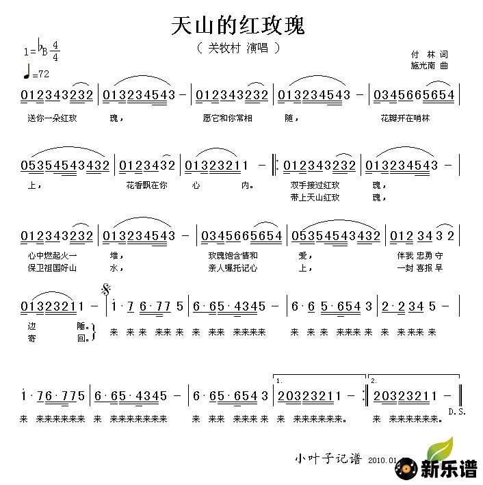《天山的红玫瑰》简谱 关牧村-小叶子制谱