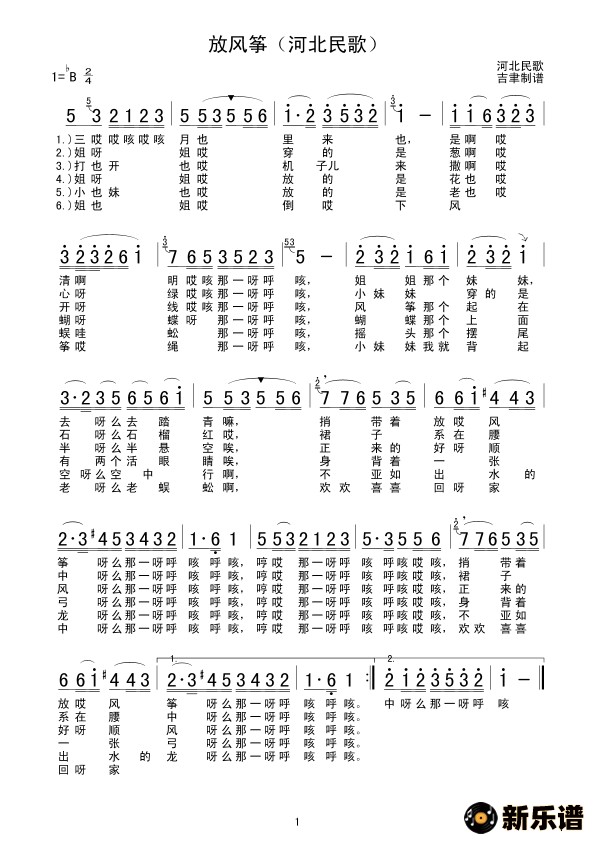 演唱的放风筝(河北民歌)歌词,放风筝(河北民歌)简谱.