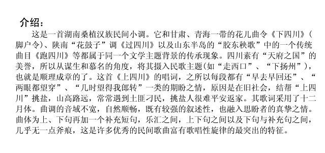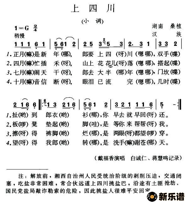 演唱的上四川(湖南桑植民歌)歌词,上四川(湖南桑植民歌)简谱.