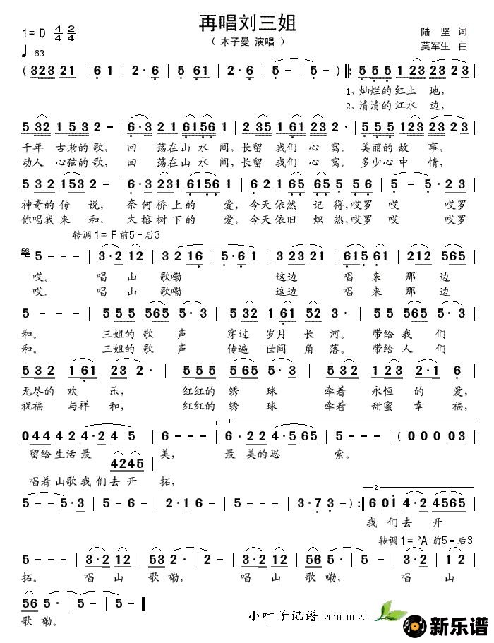《再唱刘三姐》简谱 木子曼-小叶子制谱