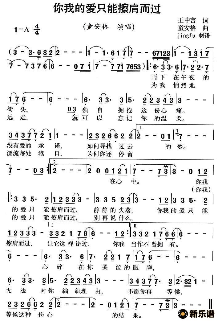童安格演唱的你我的爱只能擦肩而过歌词,你我的爱只能擦肩而过简谱.