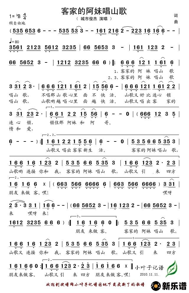 《客家的阿妹唱山歌》简谱 城市俊杰-小叶子制谱