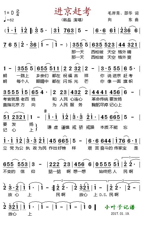 韩磊演唱的进京赶考歌词,进京赶考简谱.