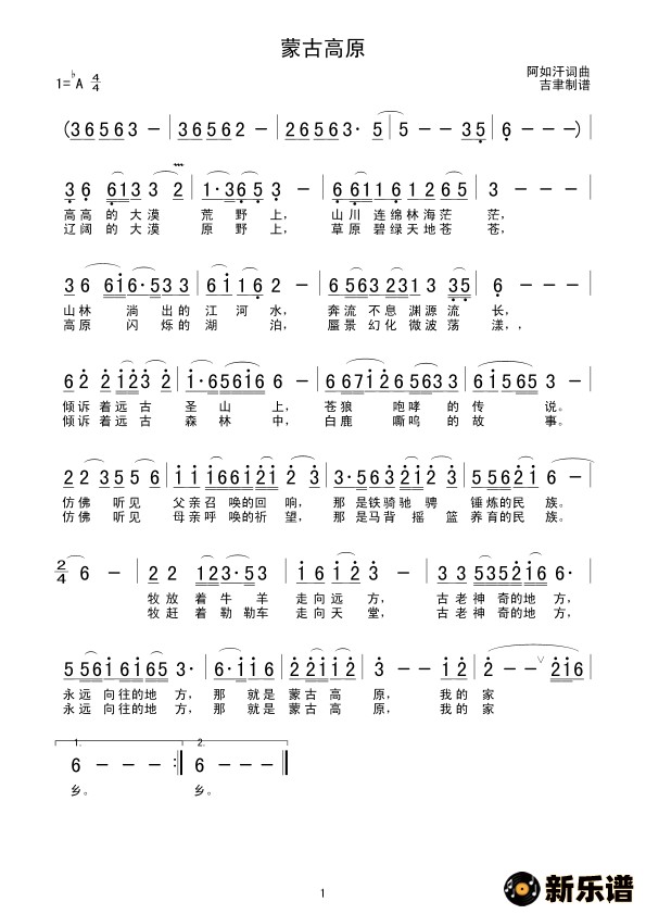 演唱的蒙古高原歌词,蒙古高原简谱.