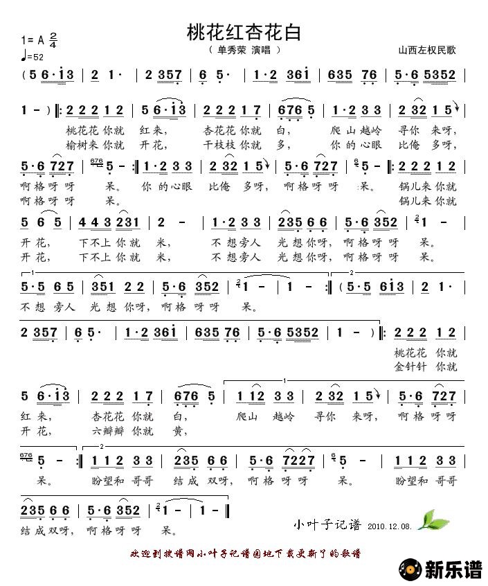 《桃花红杏花白--单秀荣》简谱 单秀荣-小叶子制谱