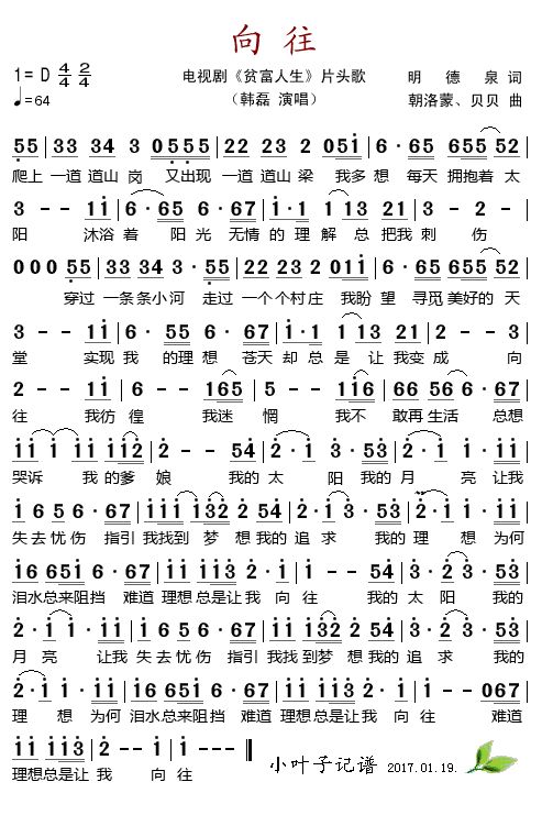 《向往(电视剧《贫富人生》片头歌)》简谱 韩磊-小叶子制谱