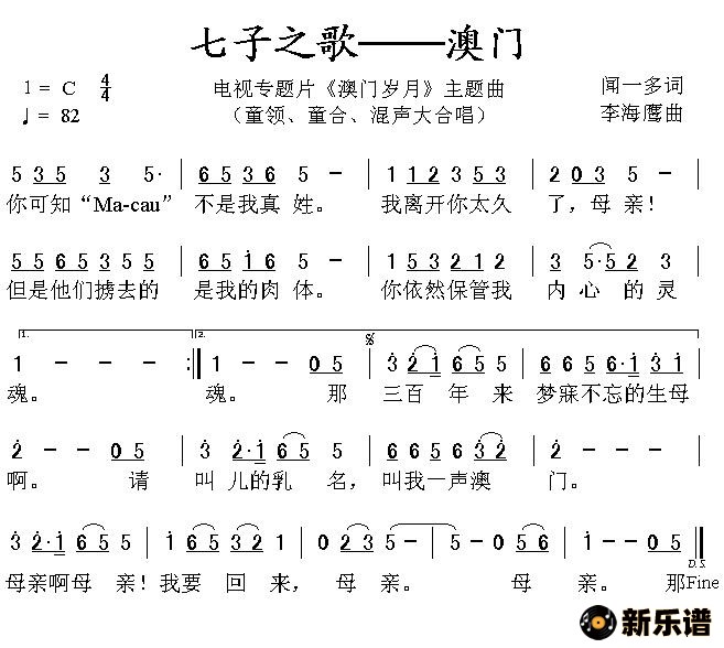 容韵琳等演唱的七子之歌——澳门(《澳门岁月》主题曲)歌词,七子之歌——澳门(《澳门岁月》主题曲)简谱.