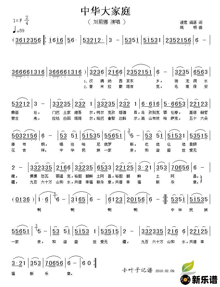 《中华大家庭》简谱 刘莉娜-小叶子制谱
