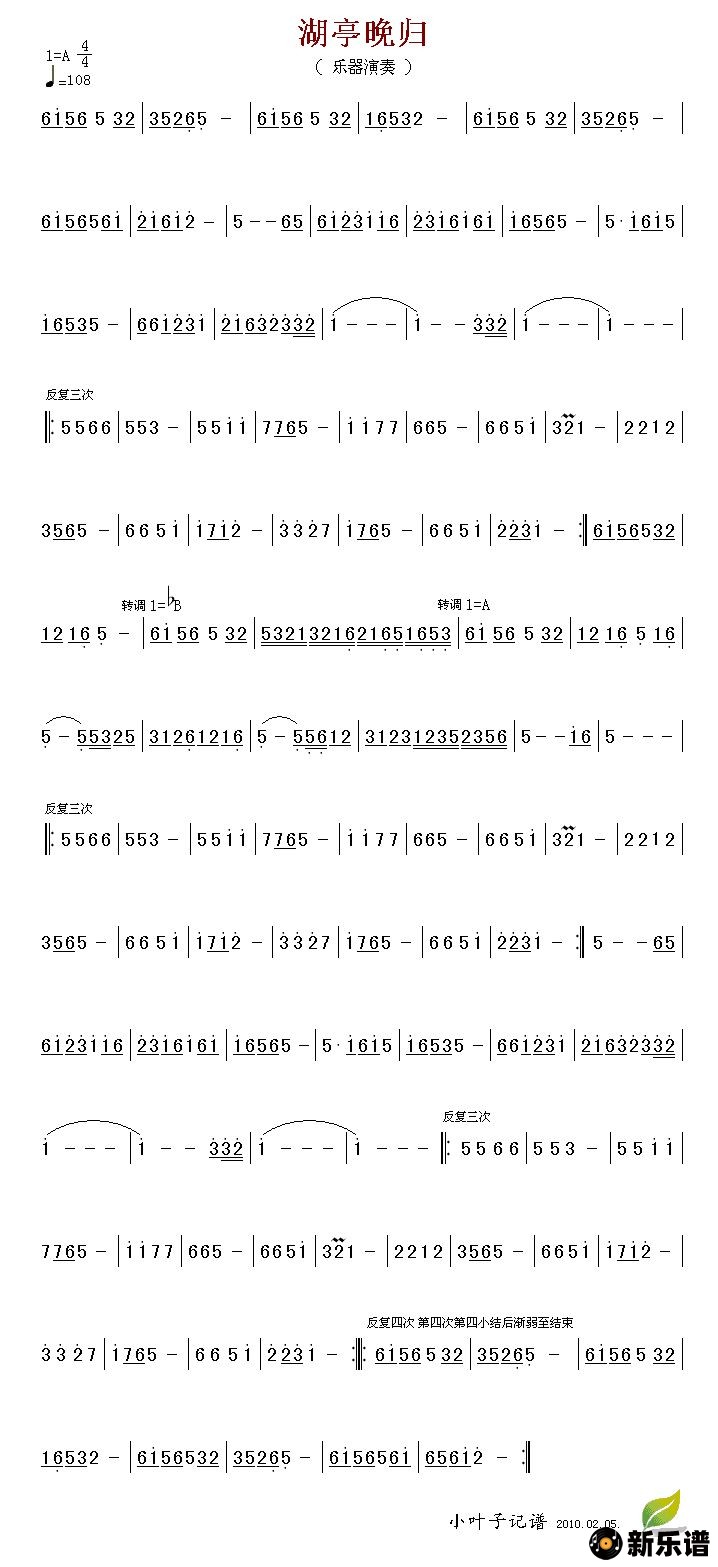 《湖亭晚归》简谱 乐器演奏-小叶子制谱