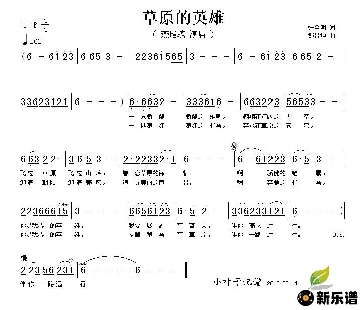 燕尾蝶演唱的草原的英雄歌词,草原的英雄简谱.