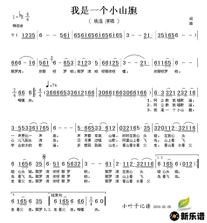 《我是一个小山胞》简谱 姚遥-小叶子制谱