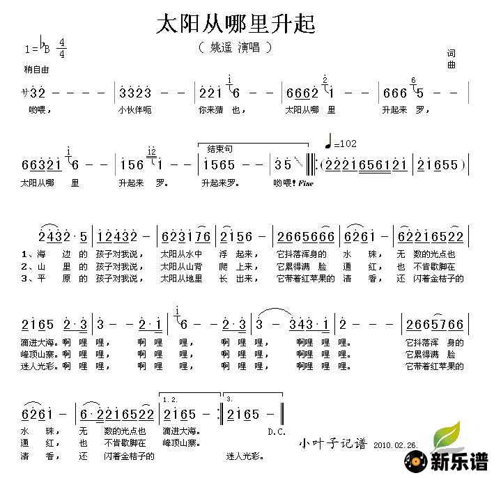《太阳从哪里升起来》简谱 姚遥-小叶子制谱