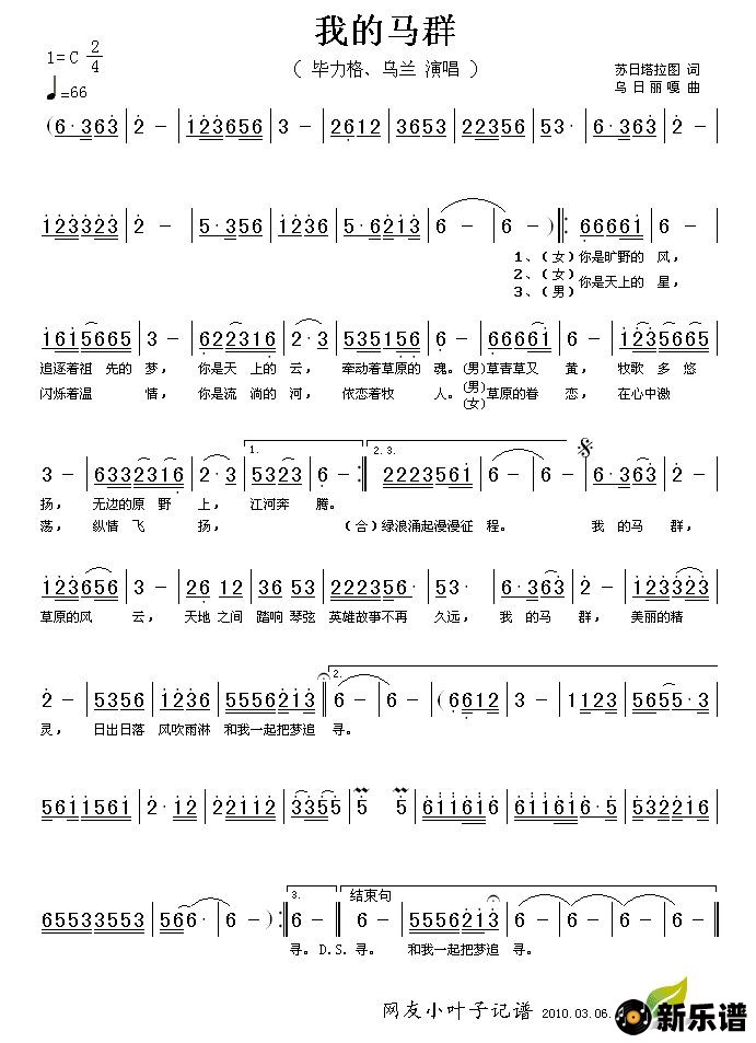 《我的马群》简谱 毕力格/乌兰-小叶子制谱