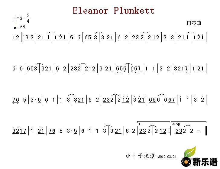 口琴演奏演唱的Eleanor Plunkett歌词,Eleanor Plunkett简谱.