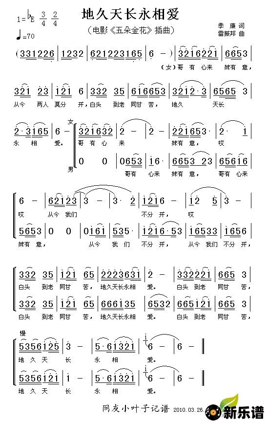 《地久天长永相爱(电影《五朵金花》插曲)》简谱 小合唱-小叶子制谱