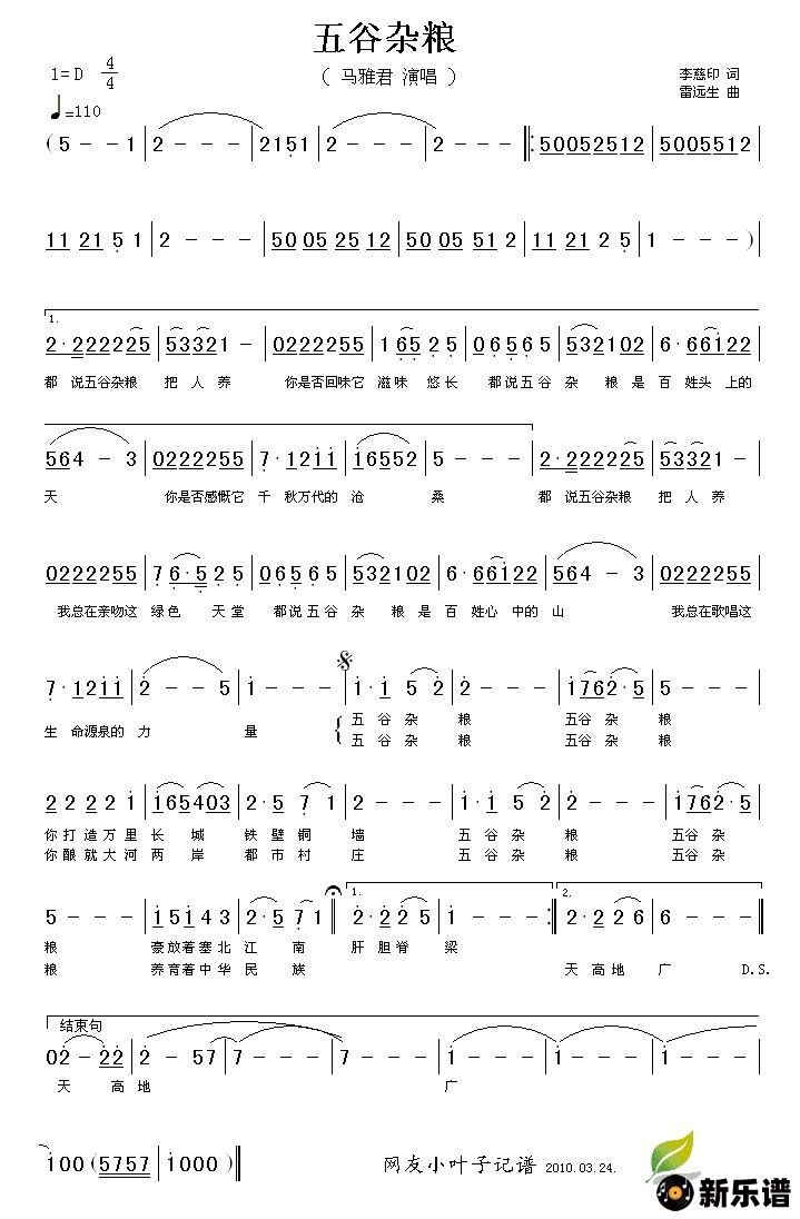《五谷杂粮》简谱 马雅君-小叶子制谱