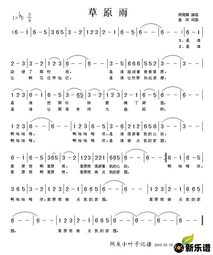 《草原雨》简谱 燕尾蝶-小叶子制谱