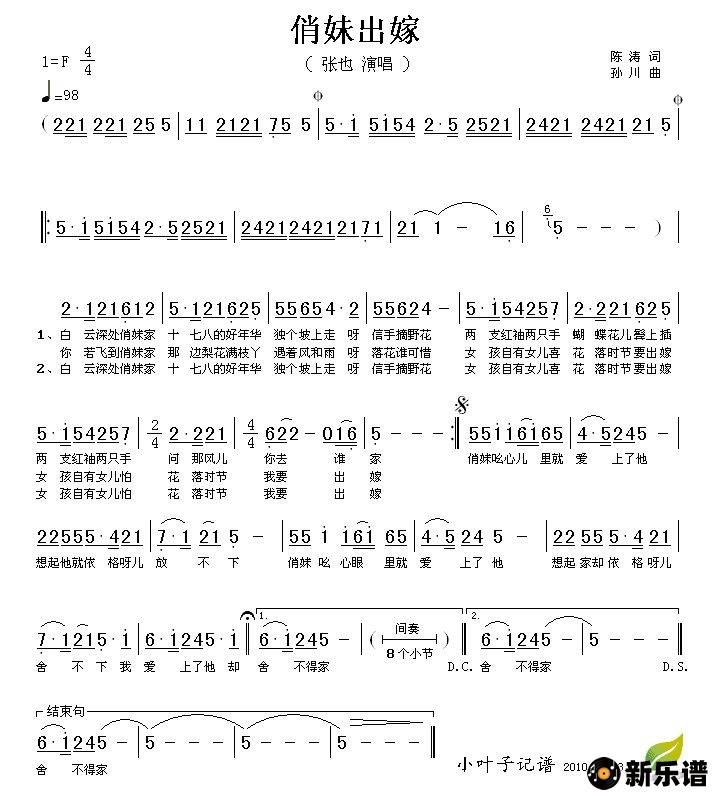 《俏妹出嫁》简谱 张也-小叶子制谱