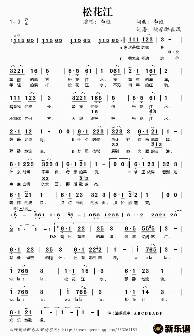 李健演唱的松花江歌词,松花江简谱.