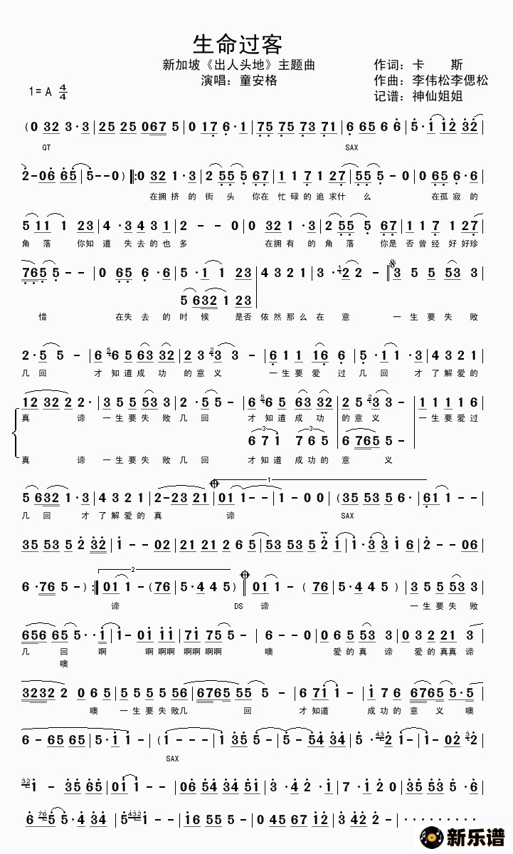 童安格演唱的生命过客《出人头地》主题曲歌词,生命过客《出人头地》主题曲简谱.