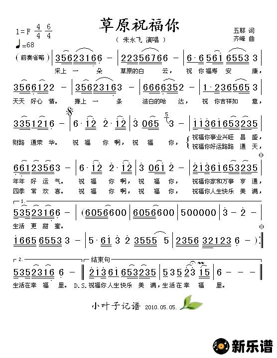 《草原祝福你》简谱 朱永飞-小叶子制谱