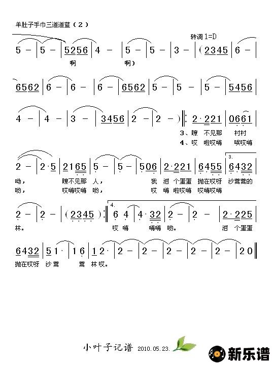 《羊肚子手巾三道道蓝》简谱 阎维文-小叶子制谱