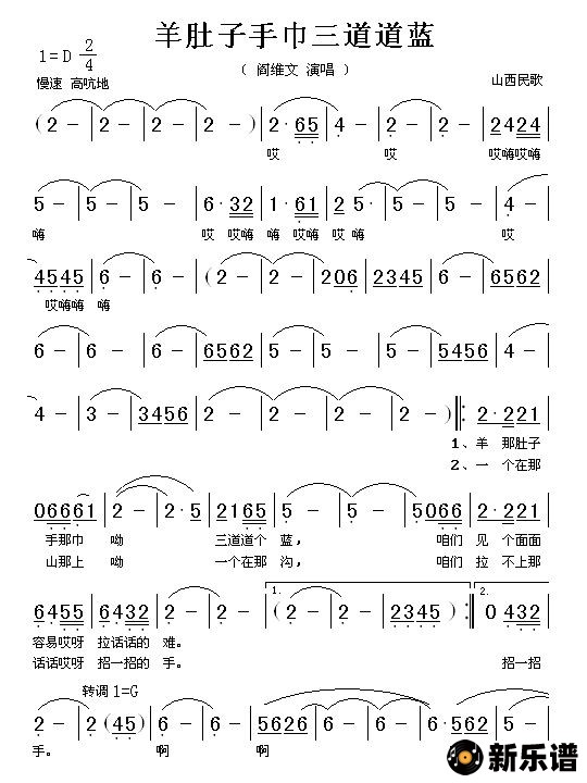 阎维文演唱的羊肚子手巾三道道蓝歌词,羊肚子手巾三道道蓝简谱.