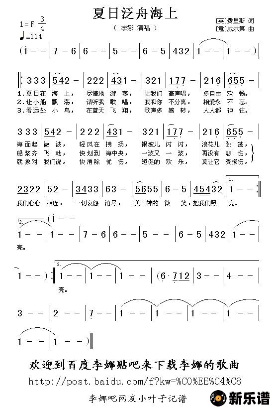 李娜演唱的夏日泛舟海上歌词,夏日泛舟海上简谱.