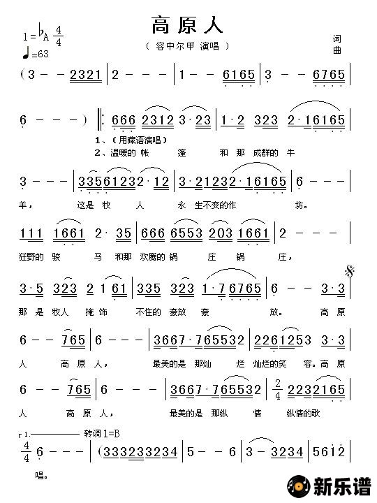 《高原人》简谱 容中尔甲-小叶子制谱