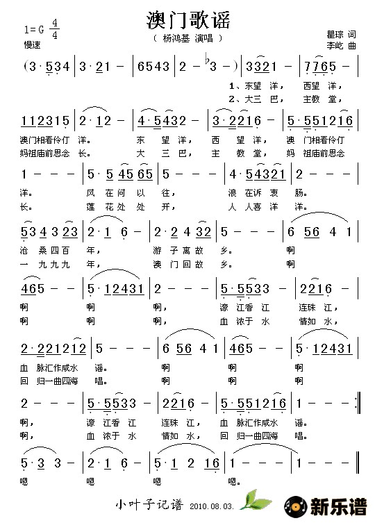 杨鸿基演唱的澳门歌谣歌词,澳门歌谣简谱.