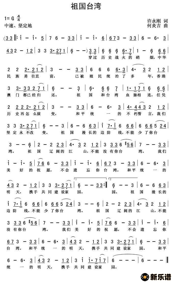 演唱的祖国台湾(许永刚词 何炎吉曲)歌词,祖国台湾(许永刚词 何炎吉曲)简谱.