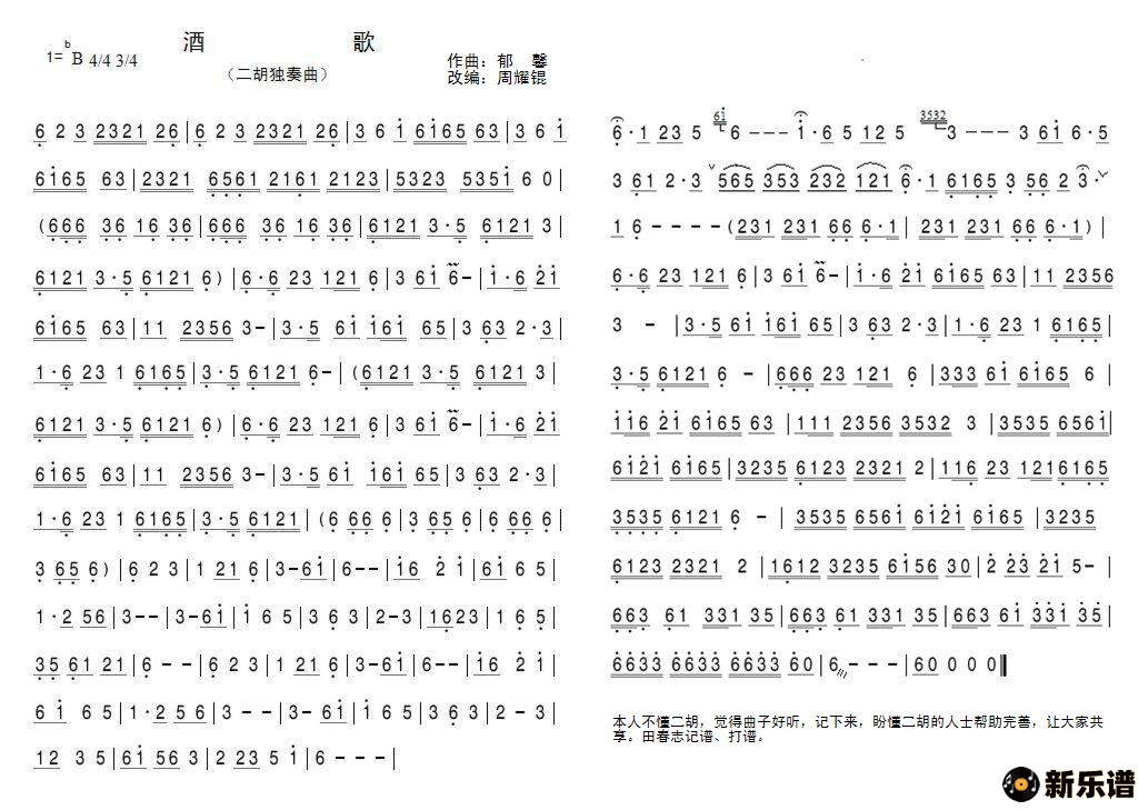 演唱的二胡独奏曲:酒歌(藏族民歌)歌词,二胡独奏曲:酒歌(藏族民歌)简谱.