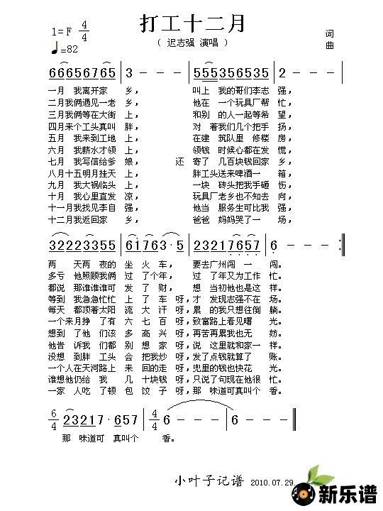 迟志强演唱的打工十二月歌词,打工十二月简谱.