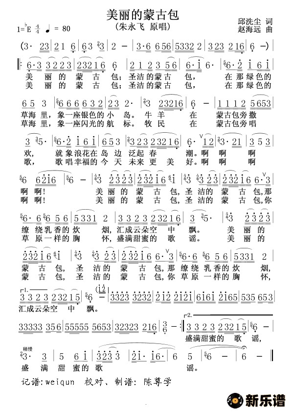 演唱的美丽的蒙古包(朱永飞)歌词,美丽的蒙古包(朱永飞)简谱.