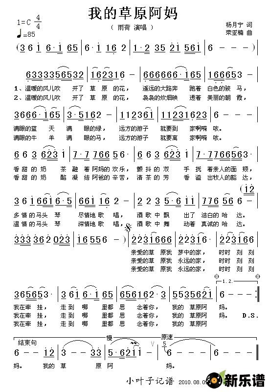 《我的草原阿妈》简谱 雨荷-小叶子制谱