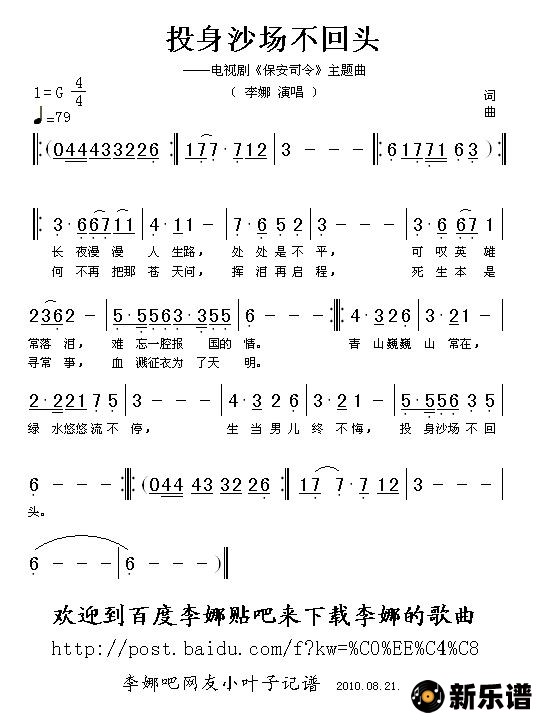 李娜演唱的投身沙场不回头歌词,投身沙场不回头简谱.