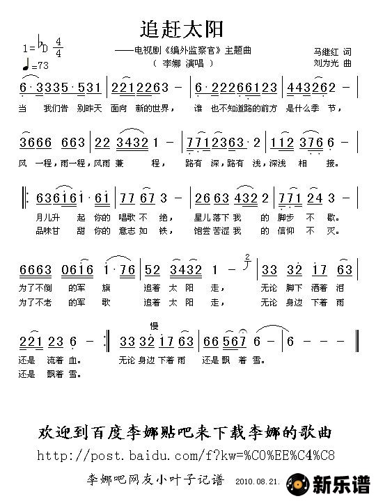 李娜演唱的追赶太阳歌词,追赶太阳简谱.