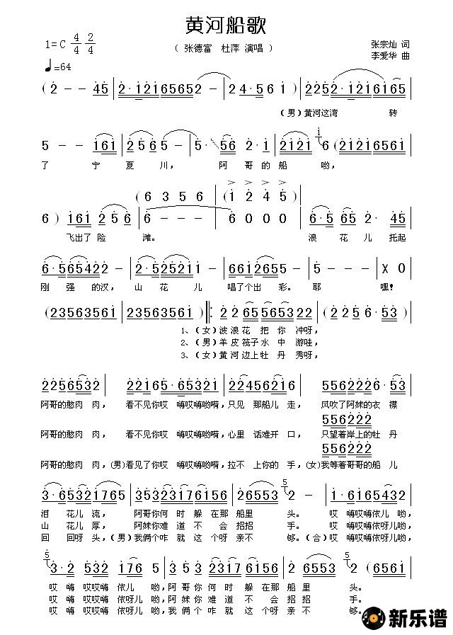 张德富/杜萍演唱的黄河船歌歌词,黄河船歌简谱.
