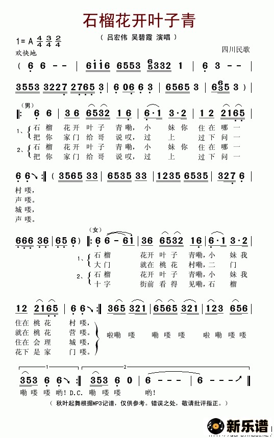 吕宏伟、吴碧霞演唱的石榴花开叶子青(四川民歌)歌词,石榴花开叶子青(四川民歌)简谱.