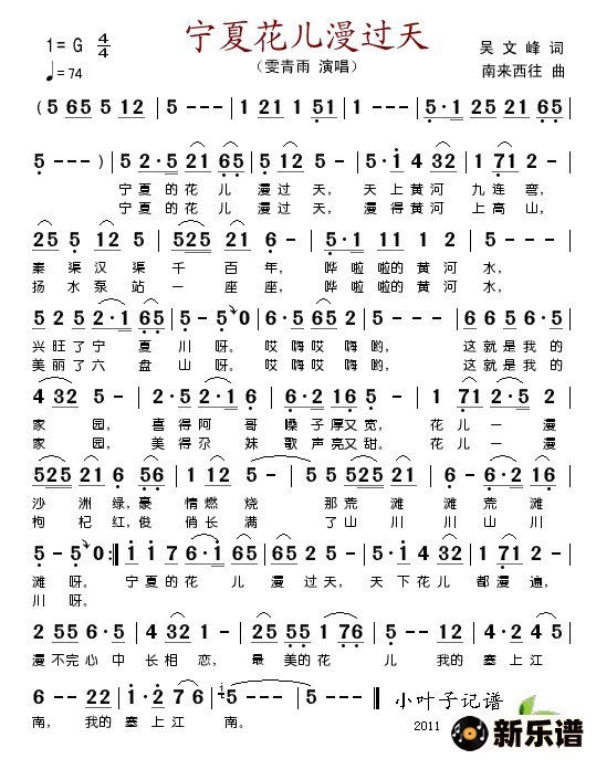 雯青雨演唱的宁夏的花儿漫过天歌词,宁夏的花儿漫过天简谱.
