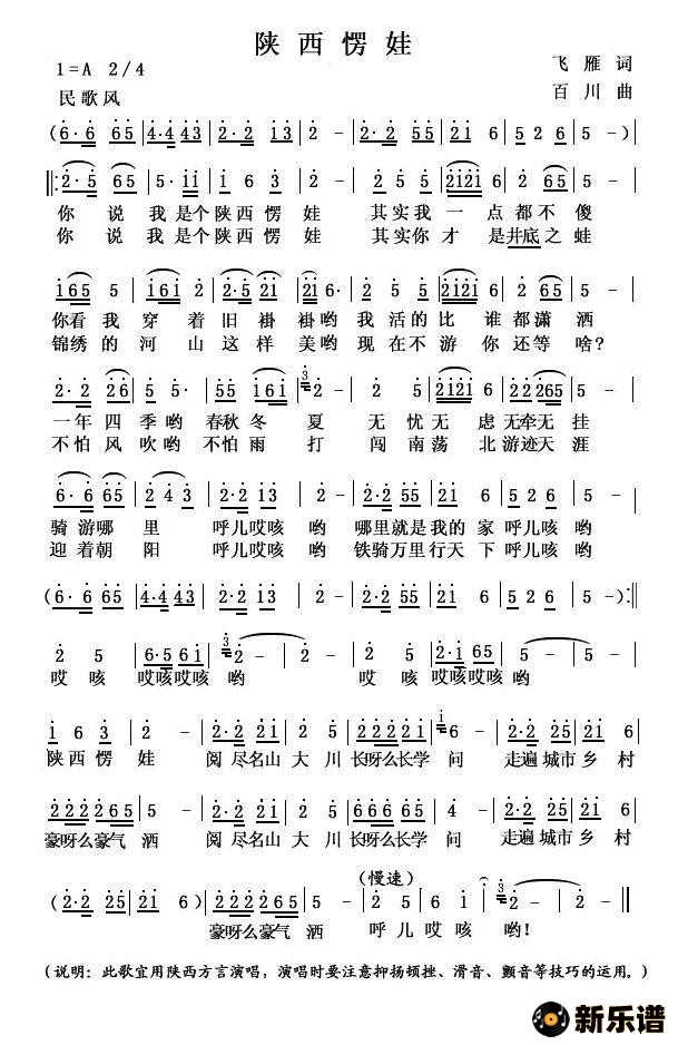 演唱的陕西楞娃歌词,陕西楞娃简谱.