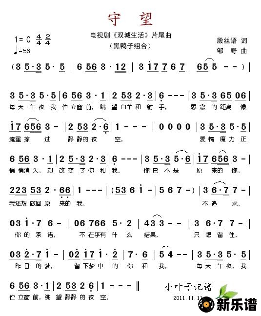 《守望(电视剧《双城生活》片尾曲)》简谱 黑鸭子组合-小叶子制谱
