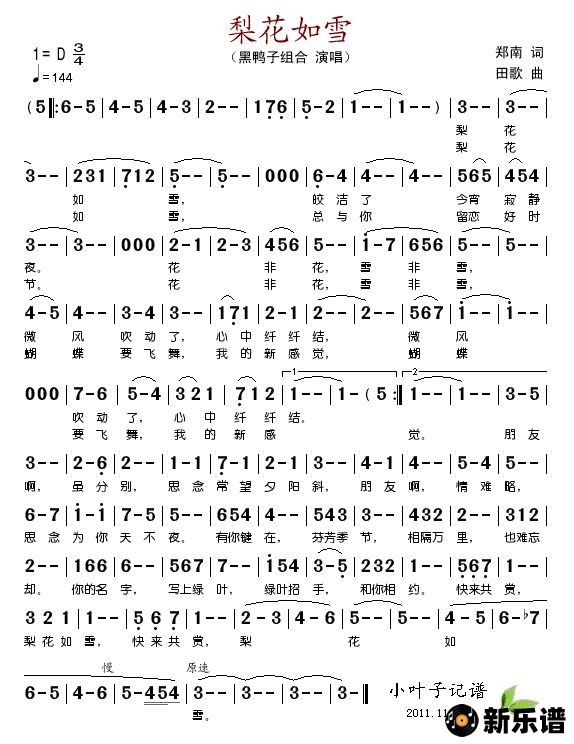 《梨花如雪》简谱 黑鸭子组合-小叶子制谱