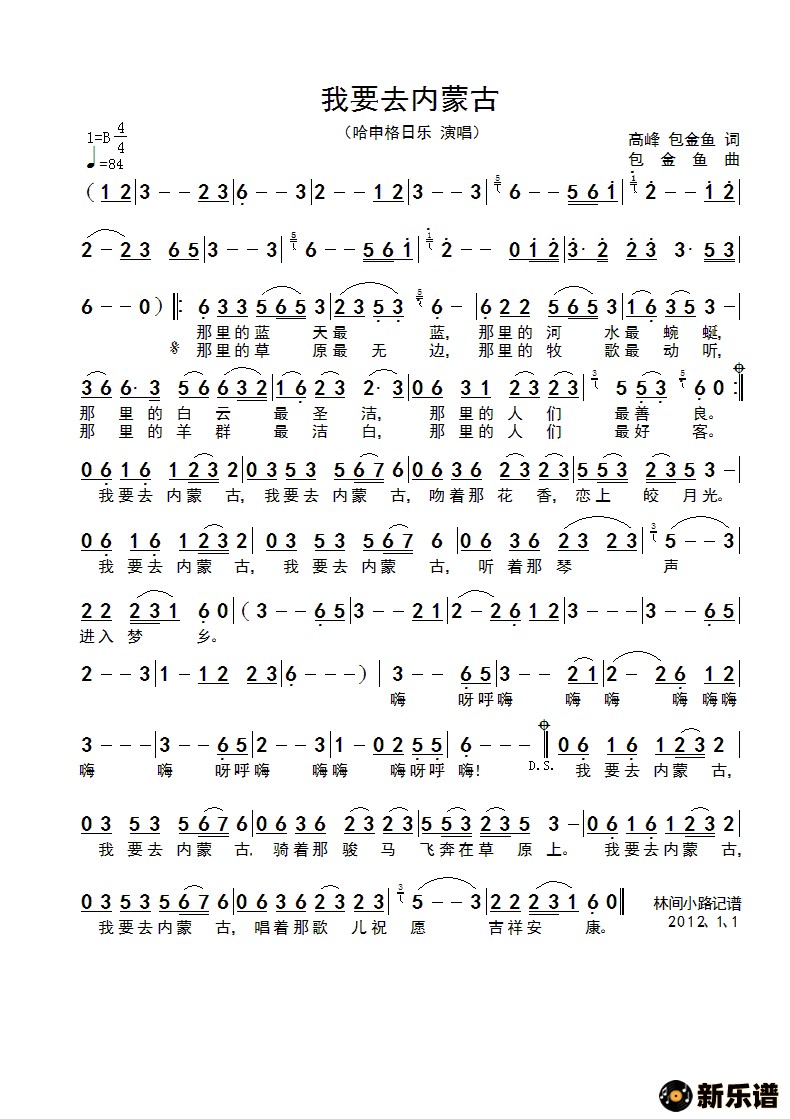 哈申格日乐演唱的我要去内蒙古歌词,我要去内蒙古简谱.