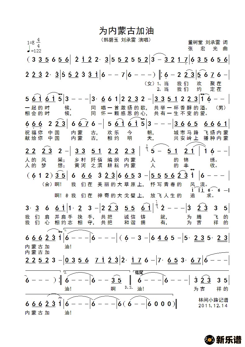 韩碧玉 刘承雷演唱的为内蒙古加油歌词,为内蒙古加油简谱.