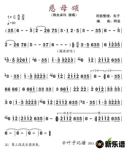 《慈母颂》简谱 降央卓玛-小叶子制谱