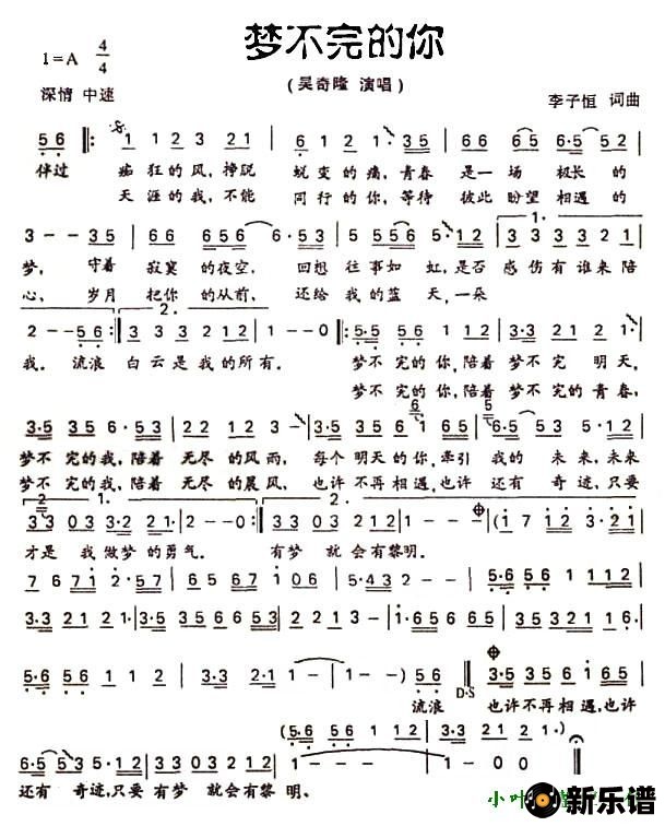 《梦不完的你》简谱 吴奇隆-小叶子制谱