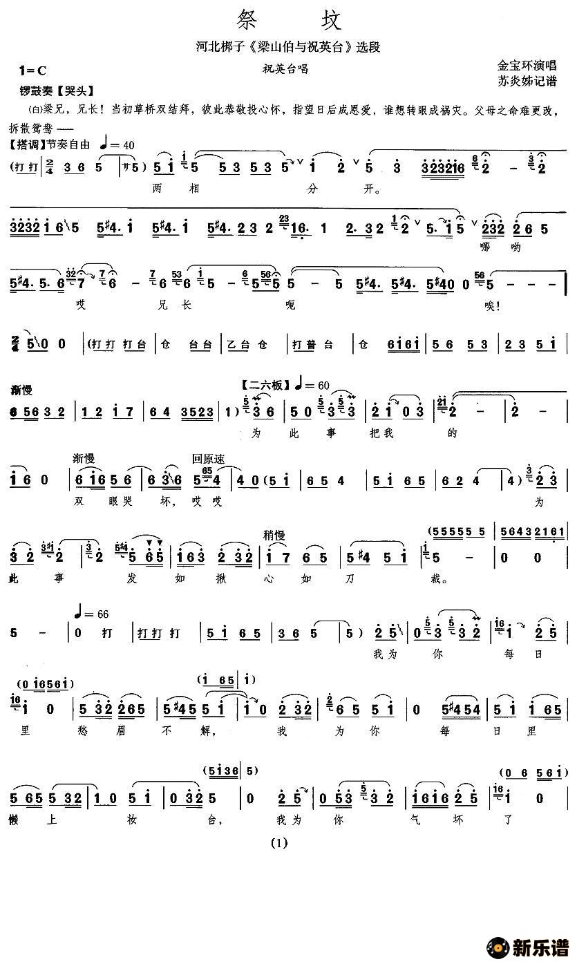 演唱的祭坟(《梁山伯与祝英台》祝英台唱段 [河北梆子] )歌词,祭坟(《梁山伯与祝英台》祝英台唱段 [河北梆子] )简谱.