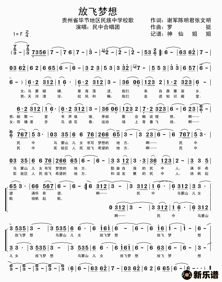 演唱的放飞梦想 贵州毕节民族中学校歌歌词,放飞梦想 贵州毕节民族中学校歌简谱.