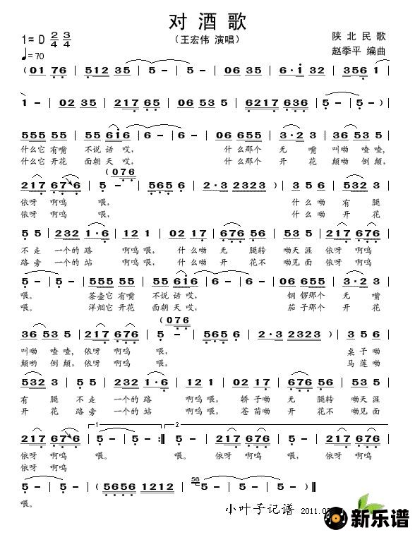 《对酒歌》简谱 王宏伟-小叶子制谱